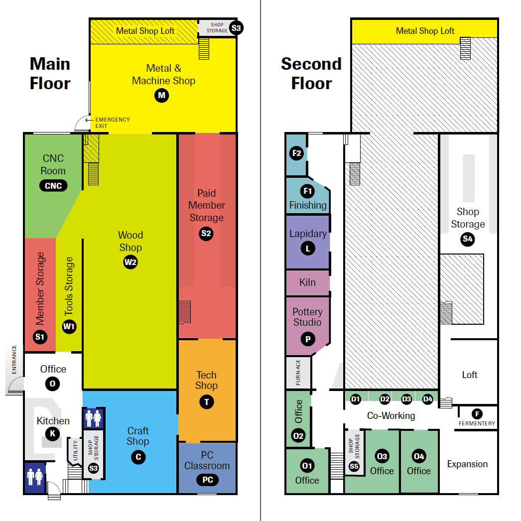 Featuring full metal shop, wood shop, CNC room, craft room, lasers, 3D Printers, lapidary, break area, lockers, and more!